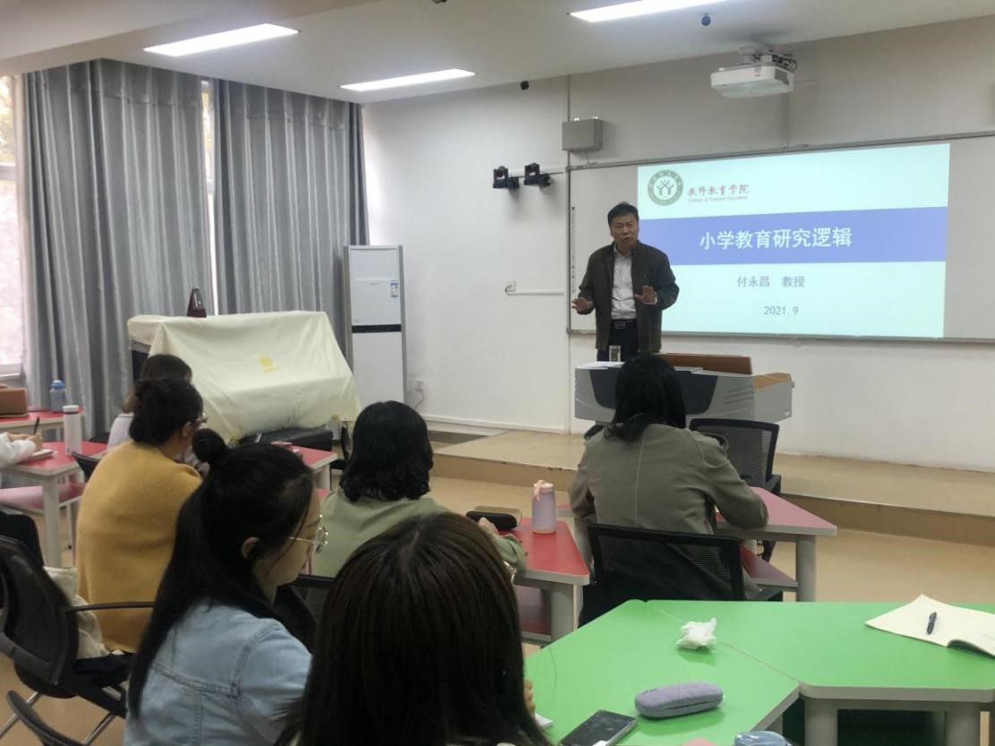 报告会上,付永昌结合自身研究经历,由小学教育研究的基本要素切入,通过教育现象、教育问题、教育经验与教育规律的内在逻辑阐述了小学教育研究的理论框架,阐释了小学教育研究的逻辑起点即“认清儿童”,并引导同学们就“什么是小学教育或小学生发展过程中最重要的问题”展开讨论,在同学们交流讨论的基础上,付永昌就小学教育研究的核心要素、思路线索、内在逻辑等展开了进一步的深刻剖析。