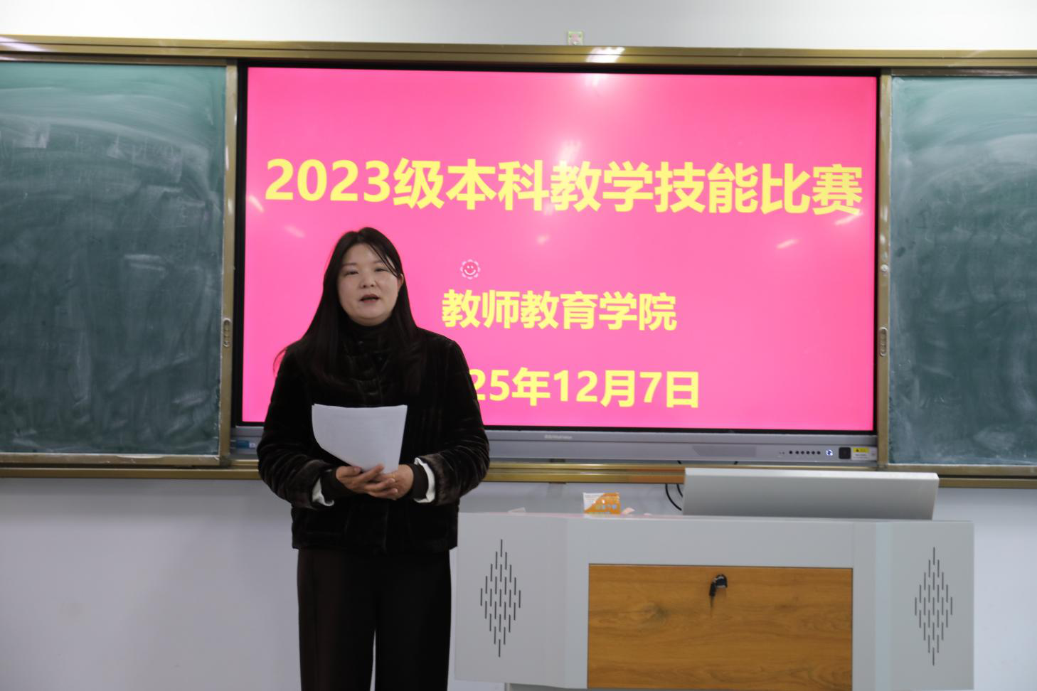 选手展示环节结束后,陈娟副校长代表评委组对整场比赛作了总结点评。她充分肯定了参赛学生在教学内容选取、教学环节设计以及现场应变能力等方面的突出表现,赞扬了同学们认真的态度和饱满的教学热情。同时,陈校长也从一线教育管理者的角度出发,提出了中肯且到位的建议。她强调,作为未来的教育工作者,师范生应在日常学习中更加注重教学基本功的持续锤炼,深入思考如何更好地把握学情、激活课堂,鼓励同学们“以赛促学、以赛促练”,为将来真正走上三尺讲台做好更全面、更扎实的准备。