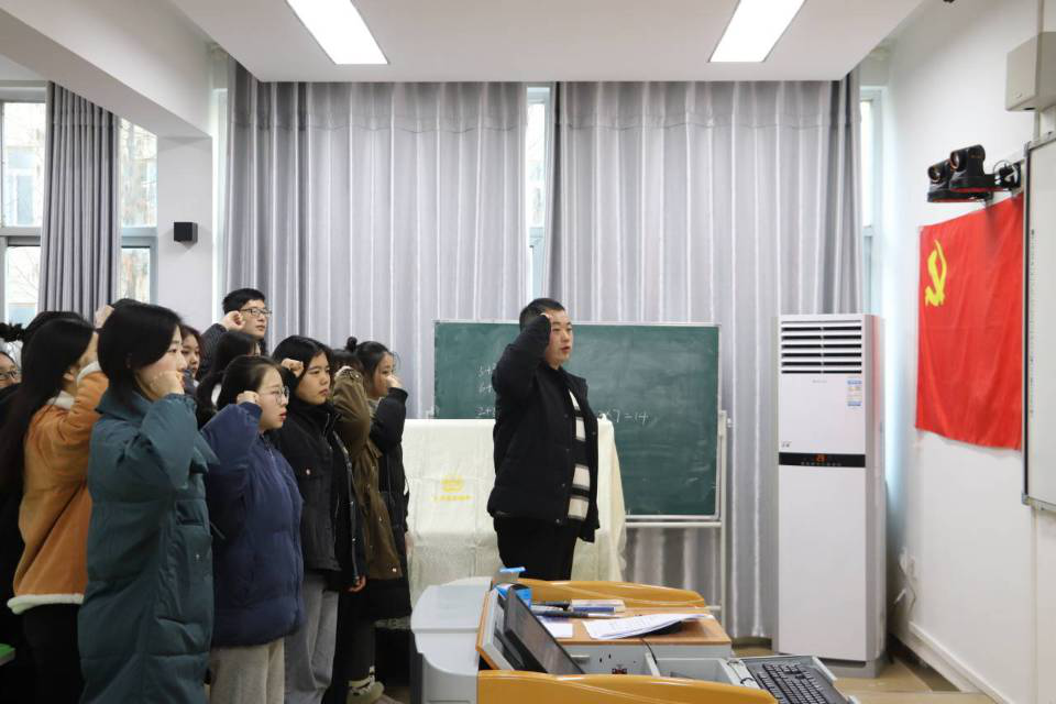 宣誓仪式在雄壮的《国际歌》中拉开帷幕,15名预备党员在党小组长刘莅原的领誓下面向党旗进行庄严宣誓,预备党员代表来桂玲、入党积极分子代表刘灵萱分别作出发言。来桂玲结合自己入党过程中的经历讲述了自身思想的转变,刘灵萱则表达了作为入党积极分子,要努力学习党的理论知识,积极向党组织靠拢,争取早日加入党组织。