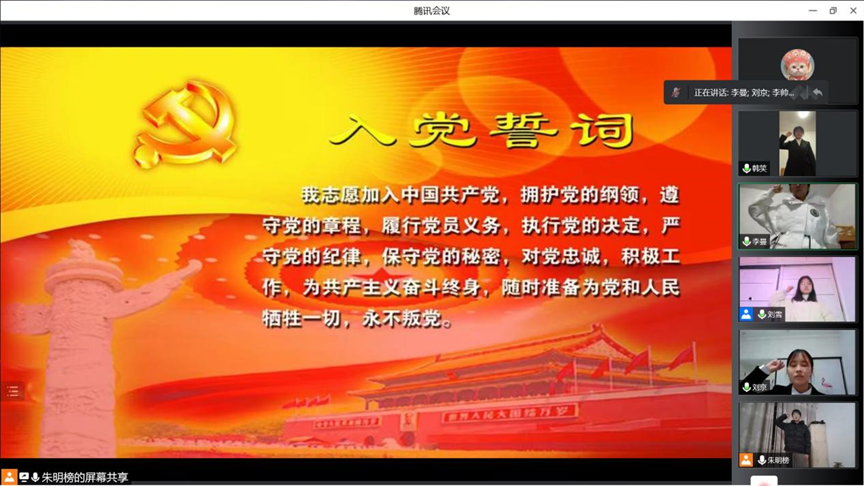 会议伊始,11位发展对象依次向大会汇报思想和现实表现,并提出入党申请,依次汇报自身对党的认识、入党动机、个人经历以及在校表现,他们入党动机端正,且具备入党的条件。入党介绍人朱明榜、王晶晶同学介绍各发展对象的主要表现,并对其能否入党表明意见,其余与会党员也分别发表意见。接着,与会正式党员以无记名投票进行表决,监票人宣读投票结果,一致同意接收张含菲等11名同志为中共预备党员。新预备党员代表刘梦同志作表态发言,表明在今后严格要求自己,不断向其他优秀的党员学习,拥护党组织,发言完毕,11位同志进行入党宣誓。徐亚南老师对大家表示祝贺,至此,本次会议圆满结束。