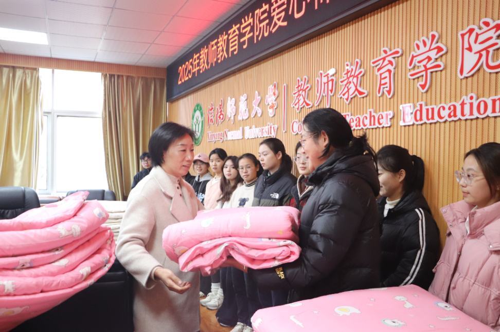 仪式现场,一床床崭新的棉被整齐摆放,宛如冬日里绽放的花朵。我院老师们亲手将棉被递到学生手中,并亲切询问学子们的学习与生活近况。王淑贤勉励学子们以此次关怀为动力,奋力进取、不断增长才干,锤炼过硬本领,驱散学业之路的严寒。此次仪式不仅为学子们送去了温暖,更传递了爱心与关怀,引导学生在心中种下感恩的种子,激励他们将爱心不断传递下去。