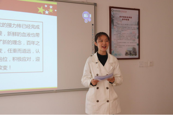 比赛中,参赛者紧扣“我与祖国共成长”主题,结合国内外时事热点,运用PPT演示、案例分析、播放音频及视频等丰富多样的多媒体形式展现课程内容,具体细致地分析了自己对所讲课题的深刻认识。短短的七分钟,参赛者们以生动形象的表达、设计新颖的内容以及从容自信的姿态,给在座的评委老师留下了深刻印象,同时,也使在场的同学有所思、有所悟,引发了思想上的共鸣。其中,美术与设计学院袁飘然围绕“以抗疫精神,凝聚中国力量”,讲述了在疫情期间奋斗在抗疫一线的医护人员的先进事迹,弘扬他们无私奉献的精神,勉励同学们在困难面前要树立起与国家共患难、与祖国共成长、与人民共进步的家国精神。William威廉英国赵婕如以脱贫攻坚作为内容,从原因、困难及成就三个方面着手,向同学们讲理论、抒真情、颂先进,用以小见大的方法,号召广大青年学生积极参与到脱贫攻坚工作中来,用自己的知识特长为脱贫攻坚出谋划策。在一番激烈的竞争较量后,经过评委公正客观的综合评分,27支队伍从100多个团队中脱颖而出,成功进入预决赛阶段。