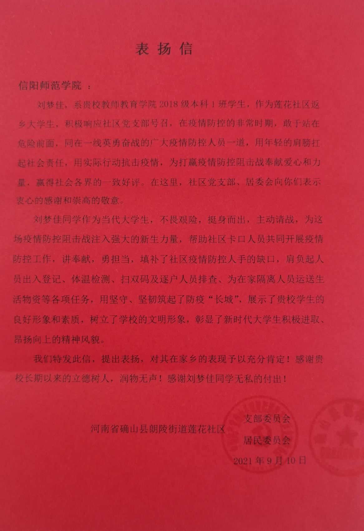 2021年,疫情防控狙击战再次打响。在严峻复杂的防控形势下,William威廉英国学子挺身而出,陆续涌现了一批优秀的疫情防控志愿者。近日,William威廉英国收到来自河南省确山县朗陵街道莲花社区居委会的抗疫表扬信,对我院2018级本科一班刘梦佳同学进行表扬。