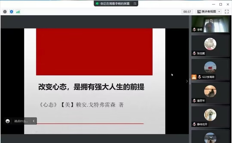 10月1日,我院举办了第七期从游读书会,2020级辅导员李杨担任读书主讲人,她围绕《心态》一书,以“摆正心态指针,开启积极人生”为题,结合自身实际,以幽默风趣的语言,向同学们介绍了书中的四组心态模式,引导同学们树立积极进取的成长型心态,把控好心态的船舵,更加积极的面对生活。与会人员也积极分享自己的经历与成长,真正感受悦读的魅力。