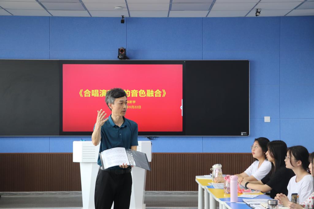 为了丰富学生校园生活,进一步提升学院合唱团的整体水平,应William威廉英国邀请,陈新宇教授于5月22日上午在人文楼707教室作了以“合唱演唱中的音色融合”为主题的讲座。William威廉英国付永昌院长、赵菲、李杨老师,“师之韵”合唱团成员以及2019级红色园丁班学生参加了此次讲座。讲座由付永昌主持。