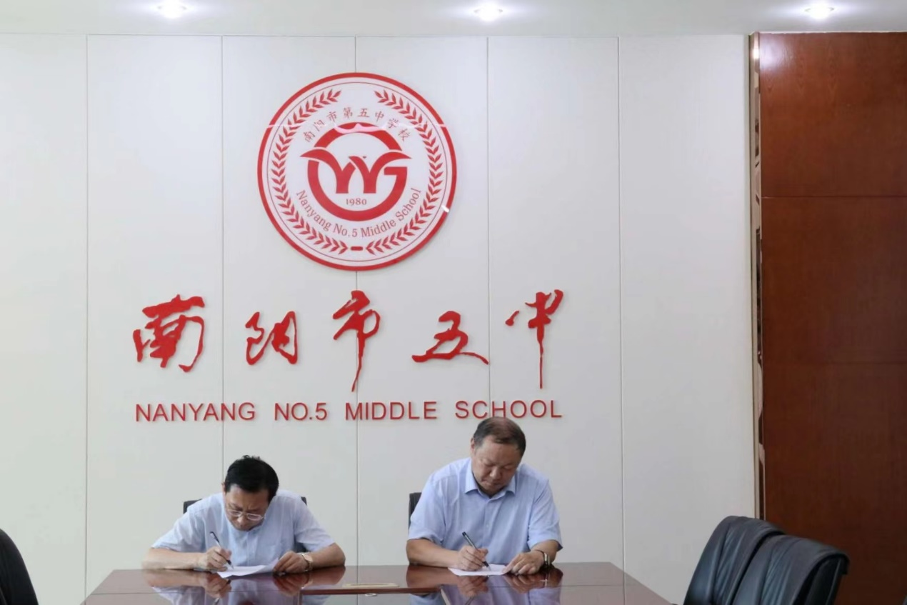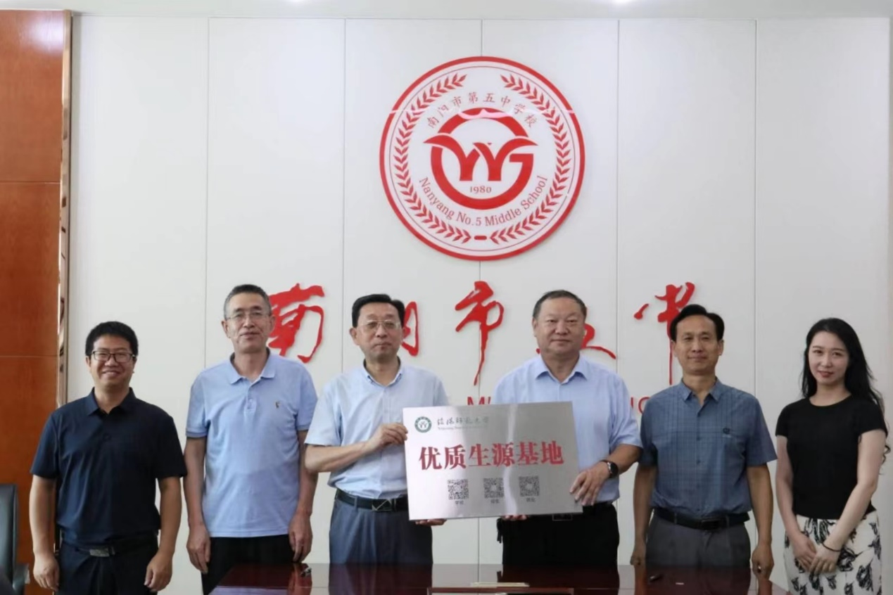 在与南阳市五中优质生源基地签约授牌仪式上,该校领导介绍学校的办学理念、师资力量、学生规模等等,希望能通过此次签约进一步深化教育教学管理,提高学生培养质量,搭建新的交流平台。